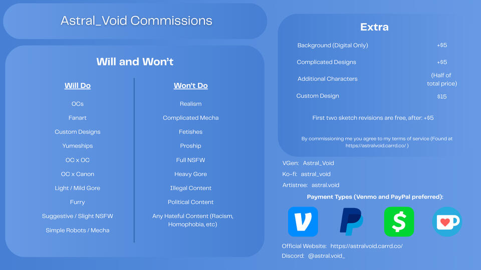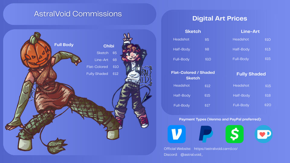 ✧ Payment is done either through Venmo, PayPal, Cash App, or Ko-Fi using an invoice / request will be sent by me. All payments must be USD.